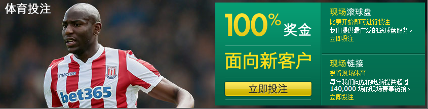 我们向客户提供全部体育范围内的丰富投注,内容涵盖足球、网球、篮球、斯诺克及乒乓球等。每场欧冠联赛足球比赛都提供超过70个不同的 滚球盘盘口,同时我们的100%欧洲精英足球奖金也适用于该赛事。您可同时通过访问"移动中的bet365",查看种类繁多的盘口和精彩赛事,其中包括我 们的滚球盘服务。如想体验该项服务,只需使用您的iPhone、iPad、Android或手机浏览器访问bet365。为增加滚球盘的兴奋感受,我们还 特别推出了现场链接,每年向您的电脑直播50,000多场精彩赛事。精选包括大师系列赛网球锦标赛和来自世界各地顶尖的国家级足球联赛。如想查看最新的体 育投注信息,请访问我们全新的投注新闻站点。